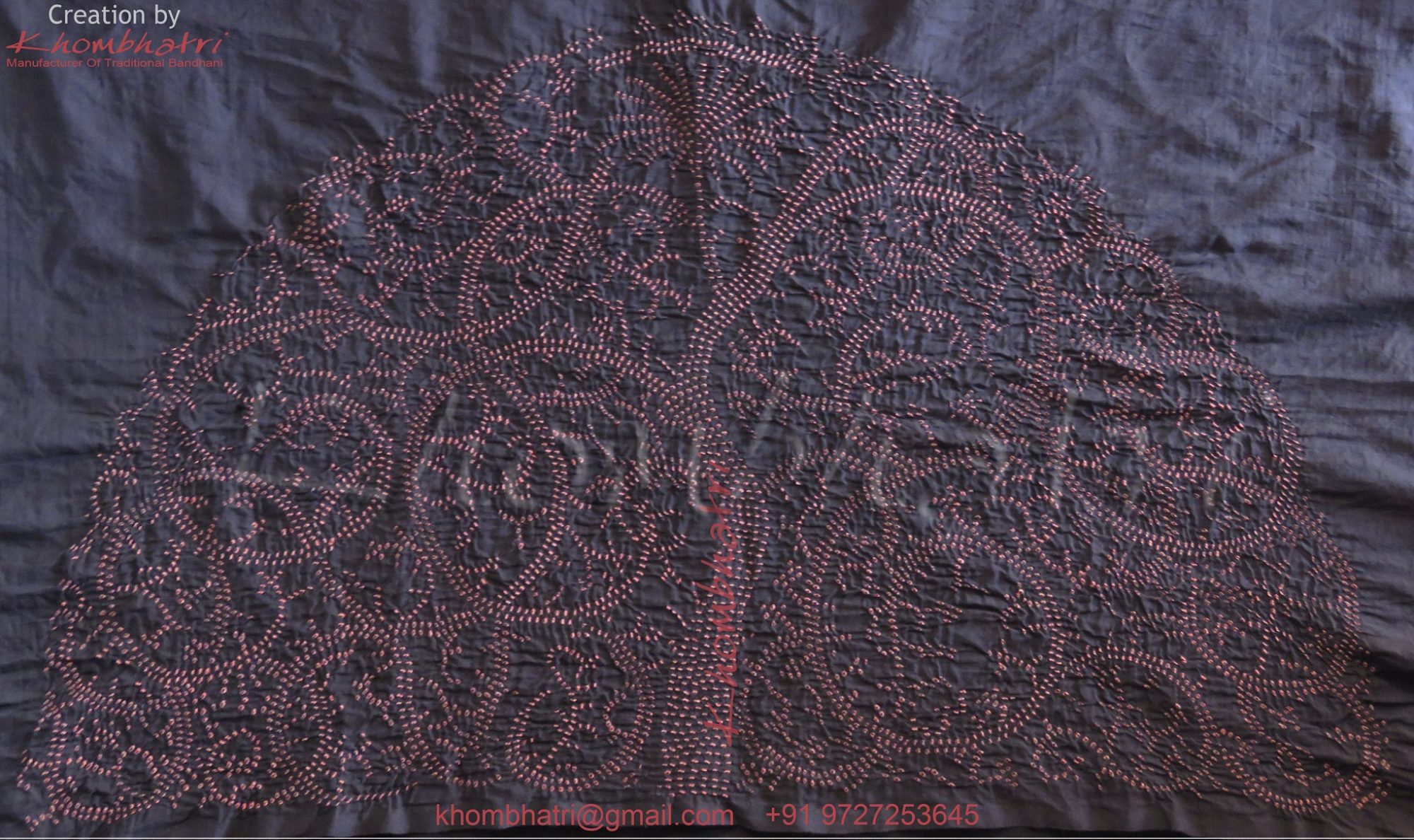 The term KHOMBHATRI is derived from the word KHOMBHI, which refers to the skilled artisans who have historically crafted these intricate garments. KHOMBHI, like other forms of BANDHANI, follows the age-old technique of tie-dyeing, but with distinct patterns and motifs that set it apart. Just as BANDHANI includes various styles such as “Shikari,” “Chandrokhani,” “Aambadad,” and “Bawanbhat,” the KHOMBHI pattern has its own rich tradition and unique evolution. These different styles of BANDHANI provided the foundation upon which KHOMBHI grew and developed.
